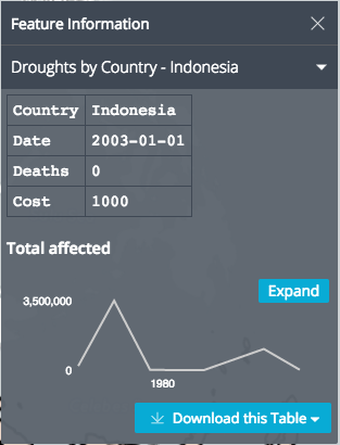 For features with time-varying table-based data structures (eg. CSV, SOS2, SDMX-JSON, if there is a time column), the feature info panel also includes a chart of the data over time, eg.
